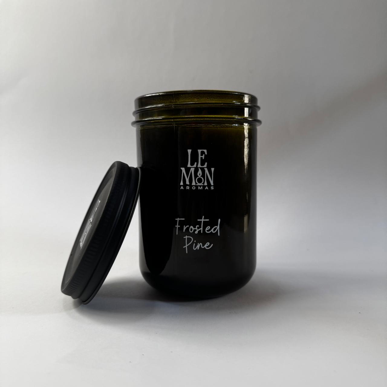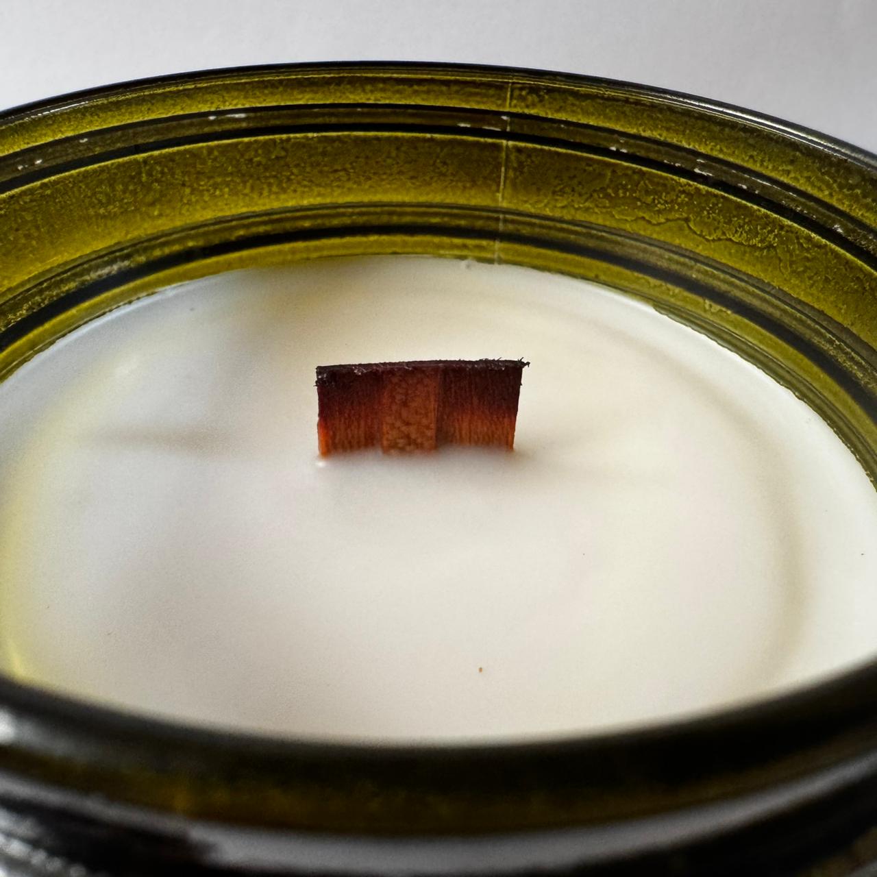 Vela aromática en envase verde de vidrio y tapa metálica con nuestra combinación de ceras naturales de soya y coco, amigables con el medio ambiente y con tu salud.