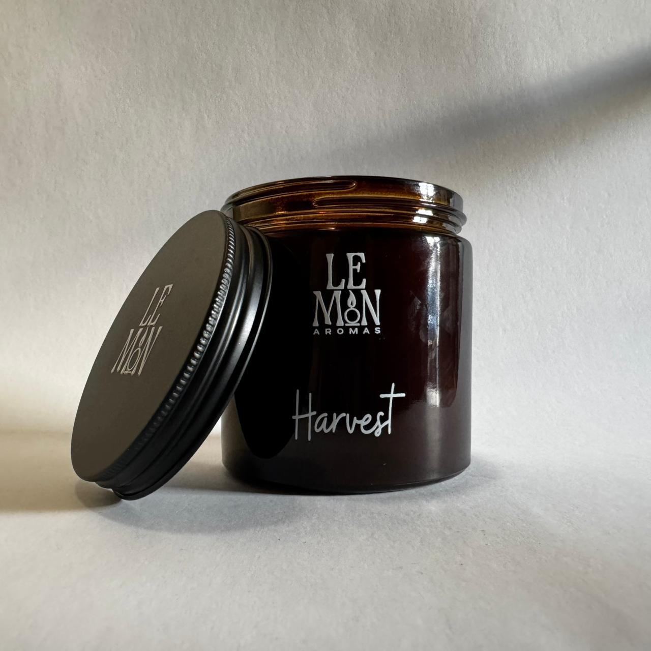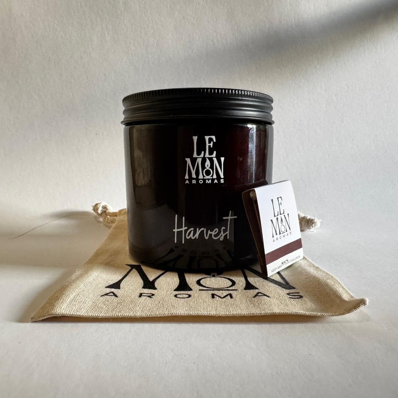 Vela aromática en envase de vidrio marrón y tapa metálica con nuestra combinación de ceras naturales de soya y coco, amigables con el medio ambiente y con tu salud.