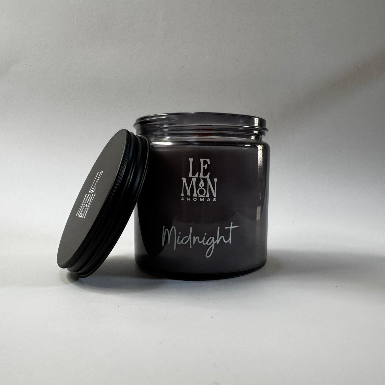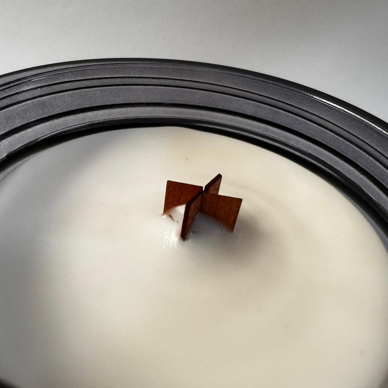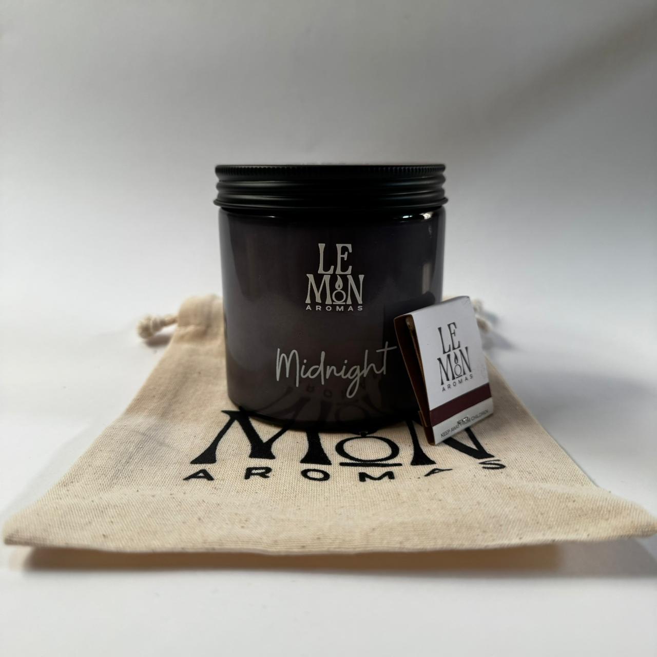 Vela aromática en envase de vidrio gris y tapa metálica con nuestra combinación de ceras naturales de soya y coco, amigables con el medio ambiente y con tu salud.