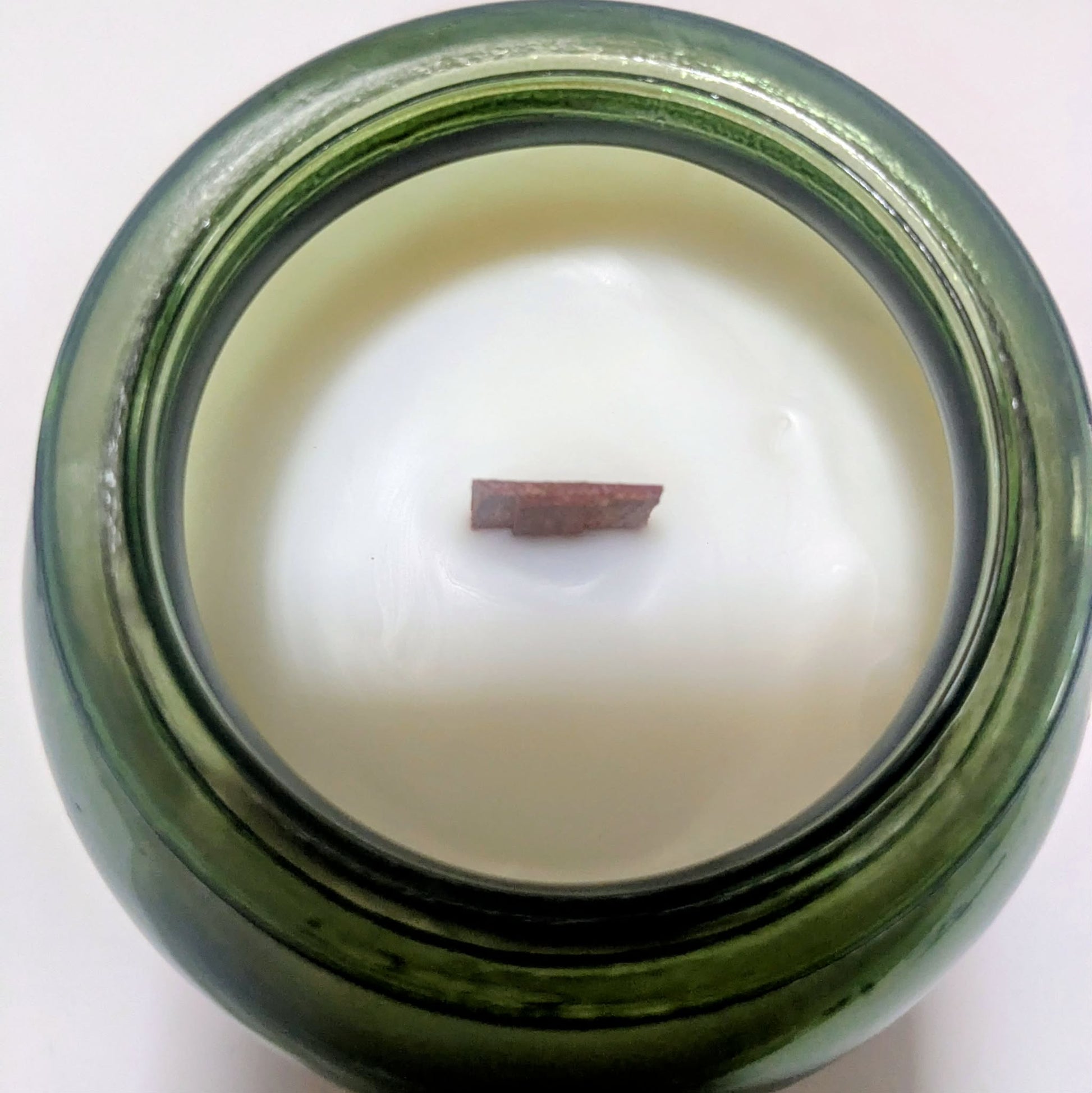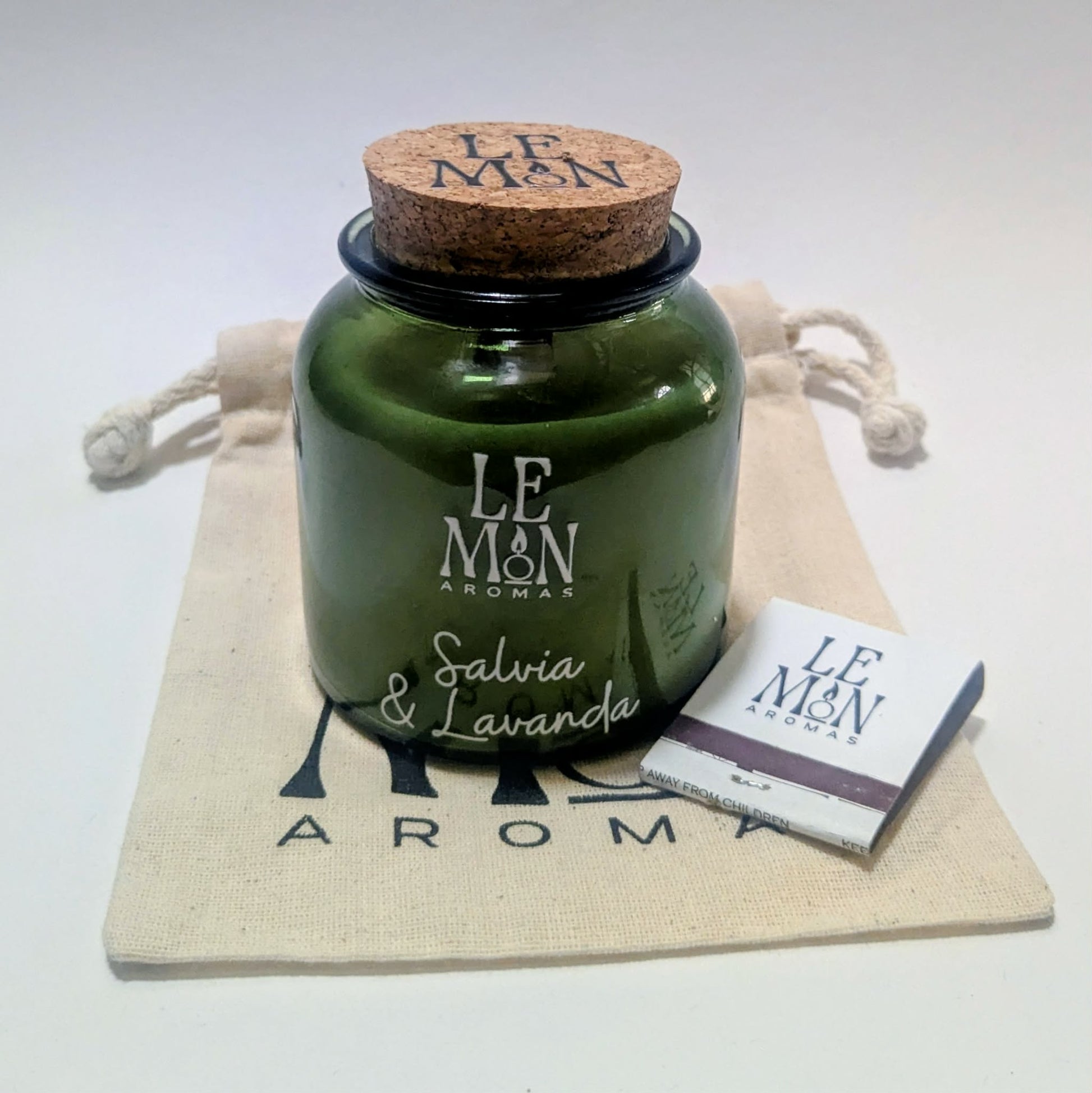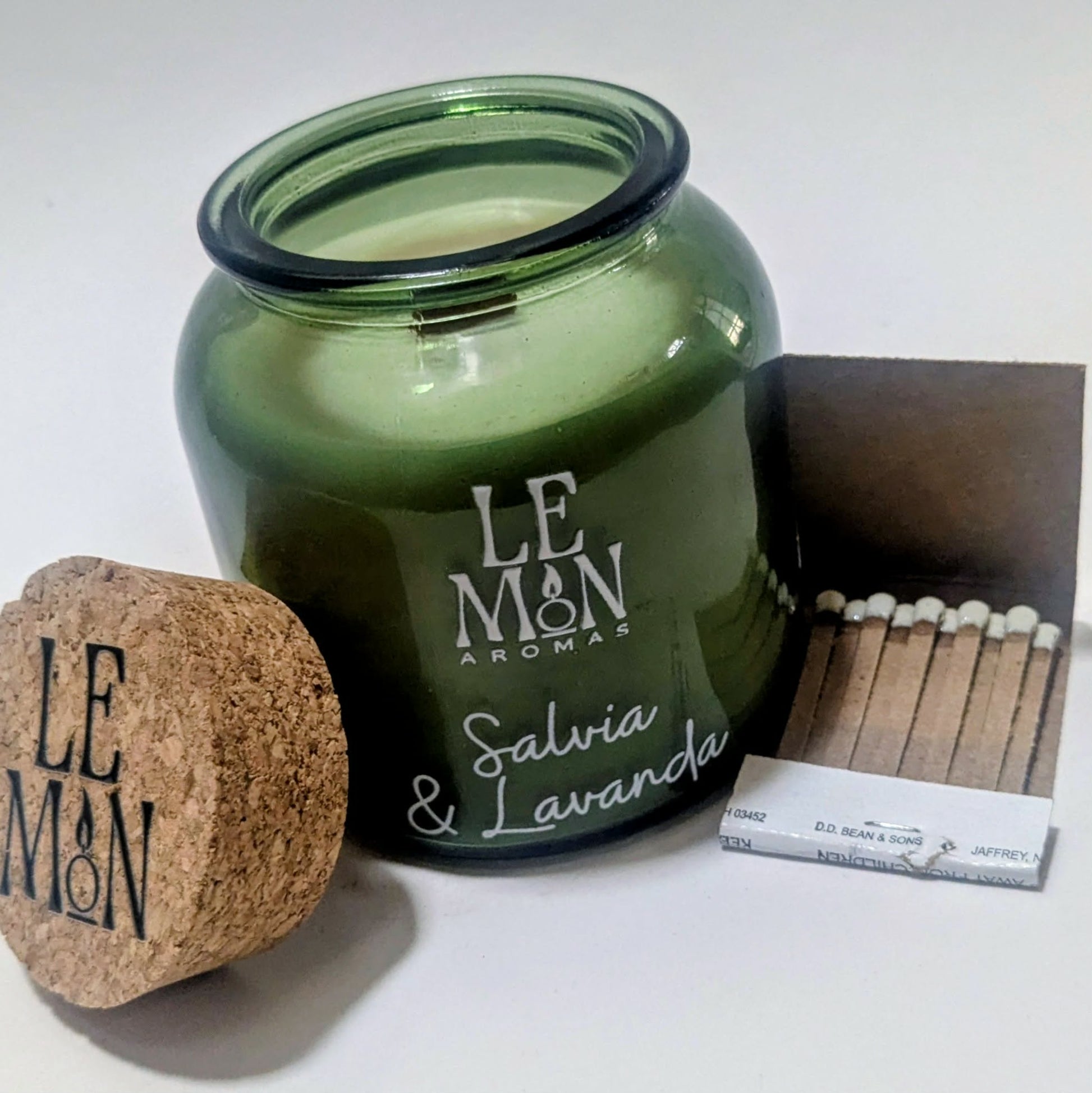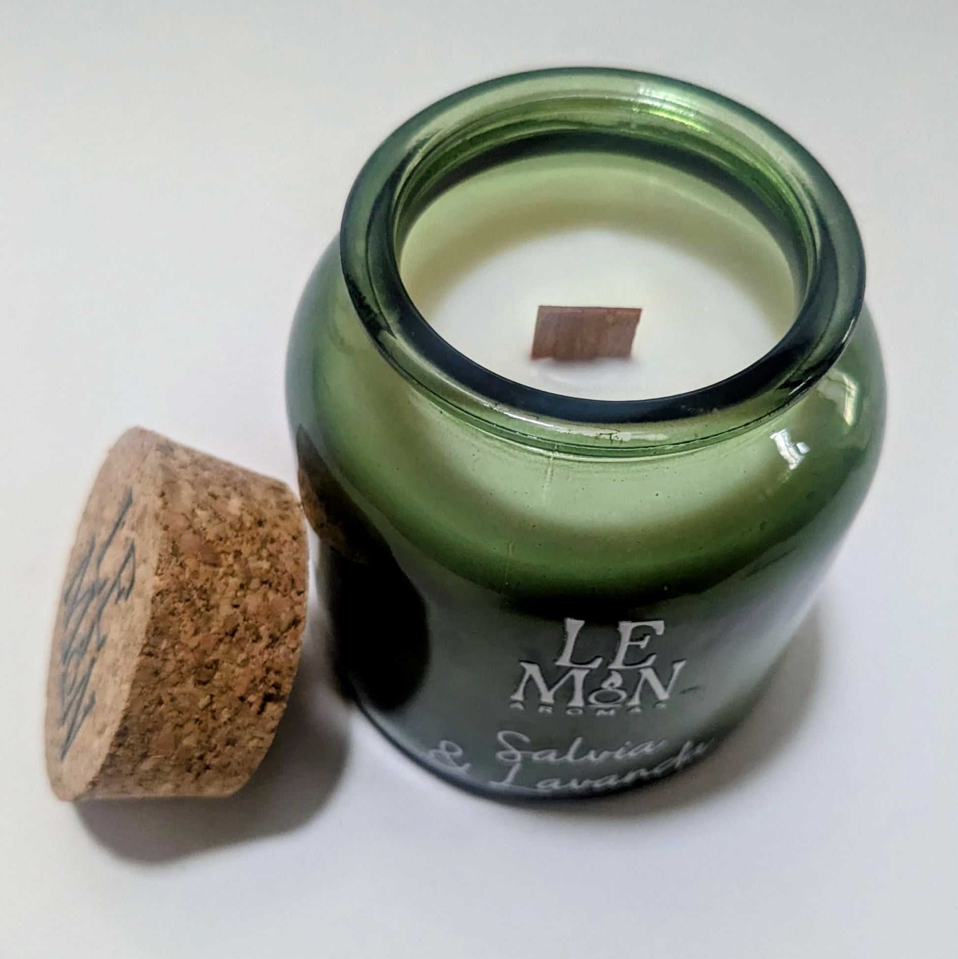Vela aromática hecha a mano en un elegante vaso de vidrio verde con tapa de corcho y nuestra combinación de ceras naturales de soya y coco.