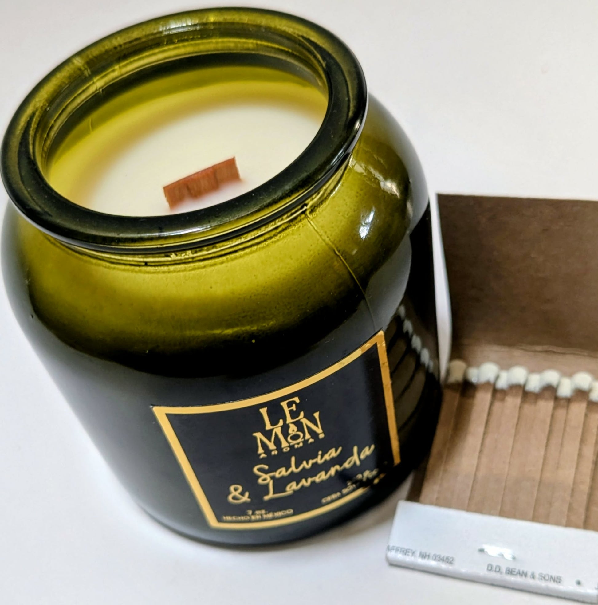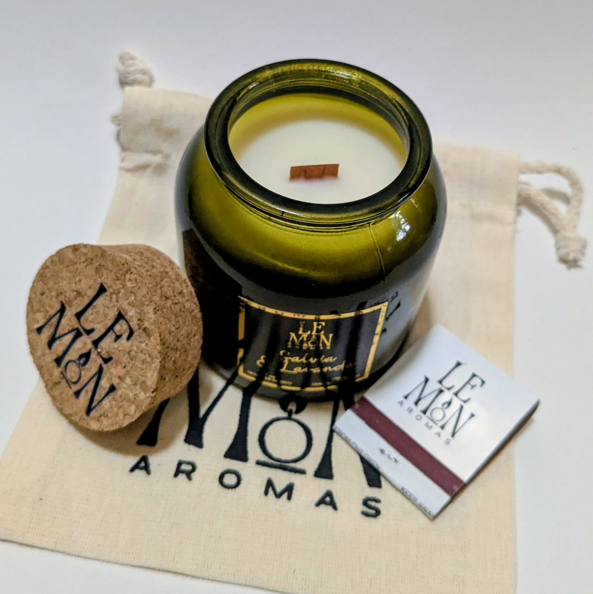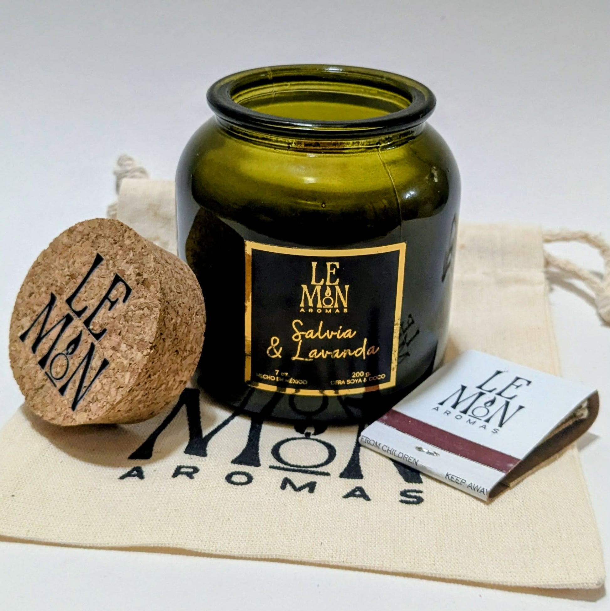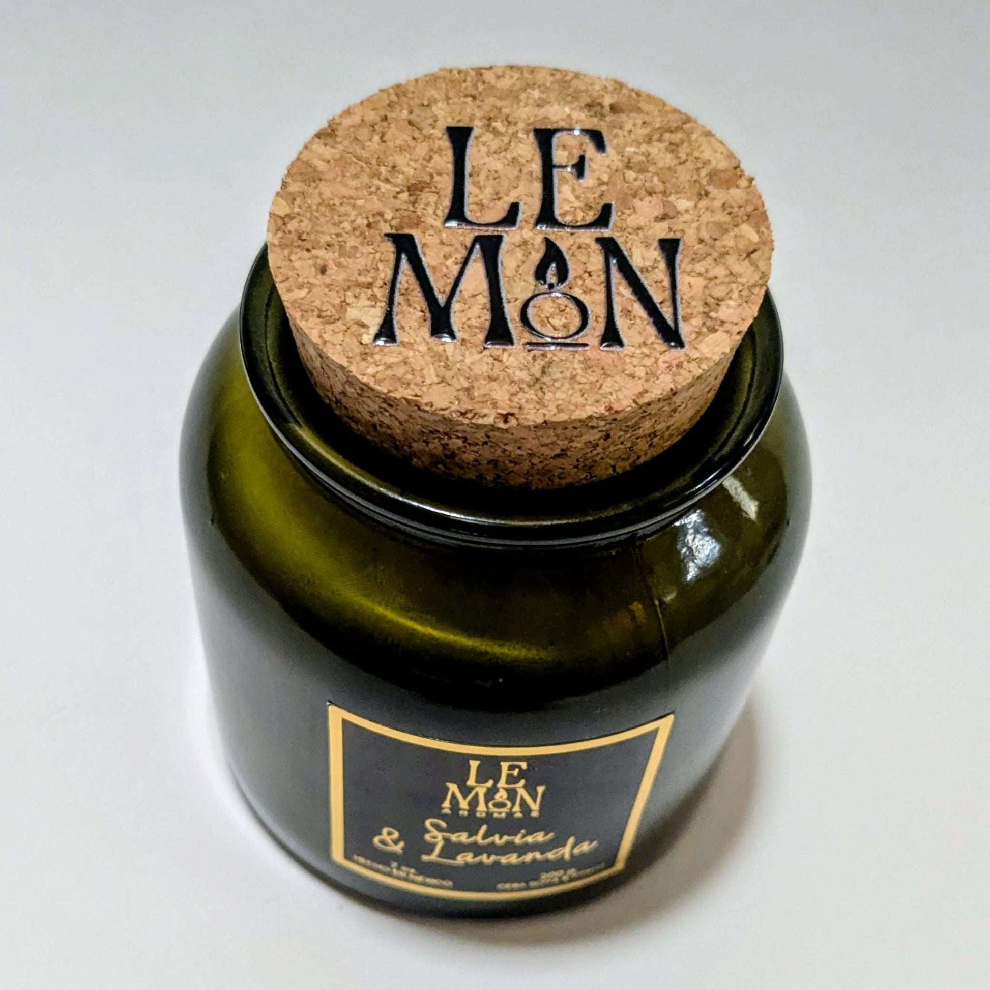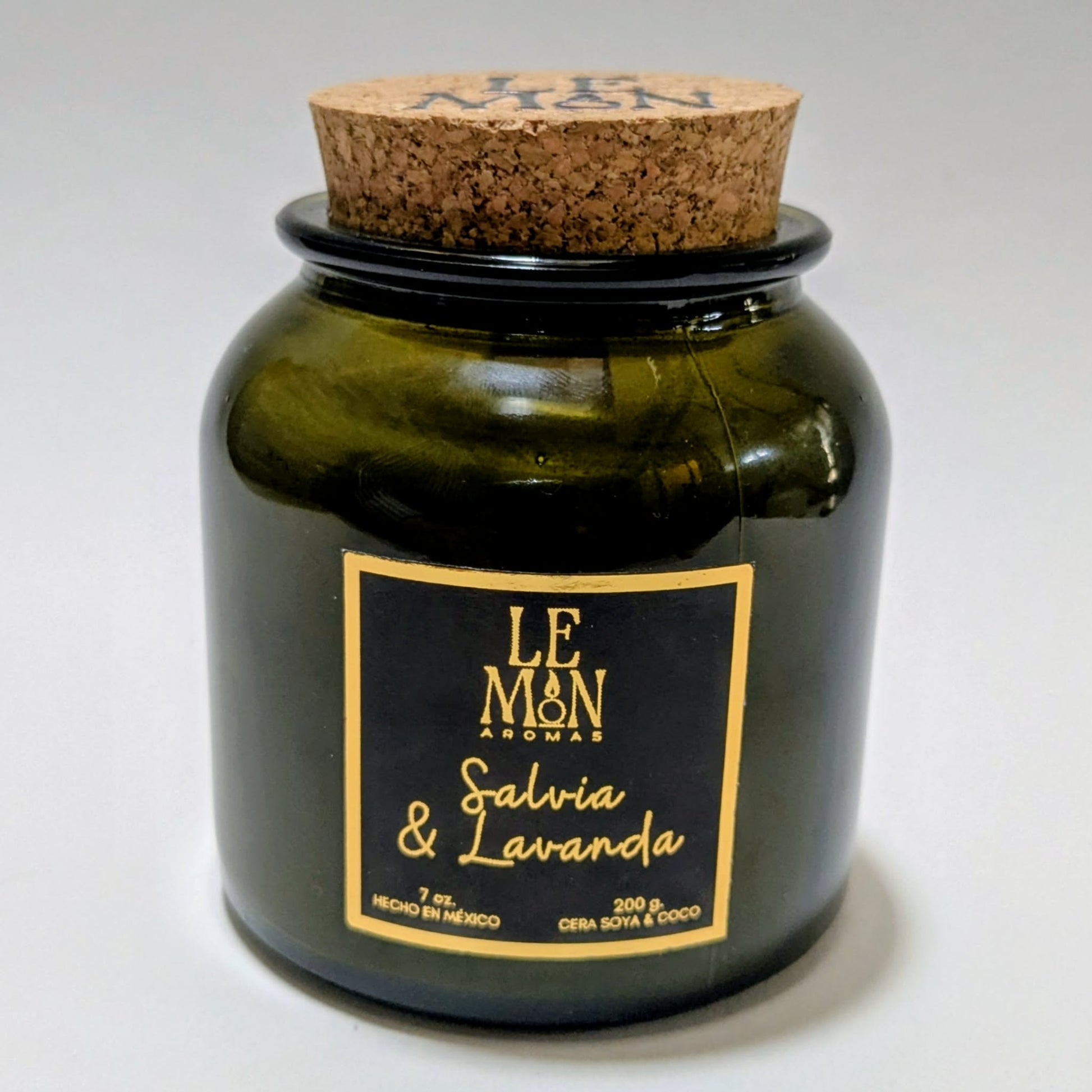 Vela aromática hecha a mano en un elegante vaso de vidrio verde con tapa de corcho y nuestra combinación de ceras naturales de soya y coco.