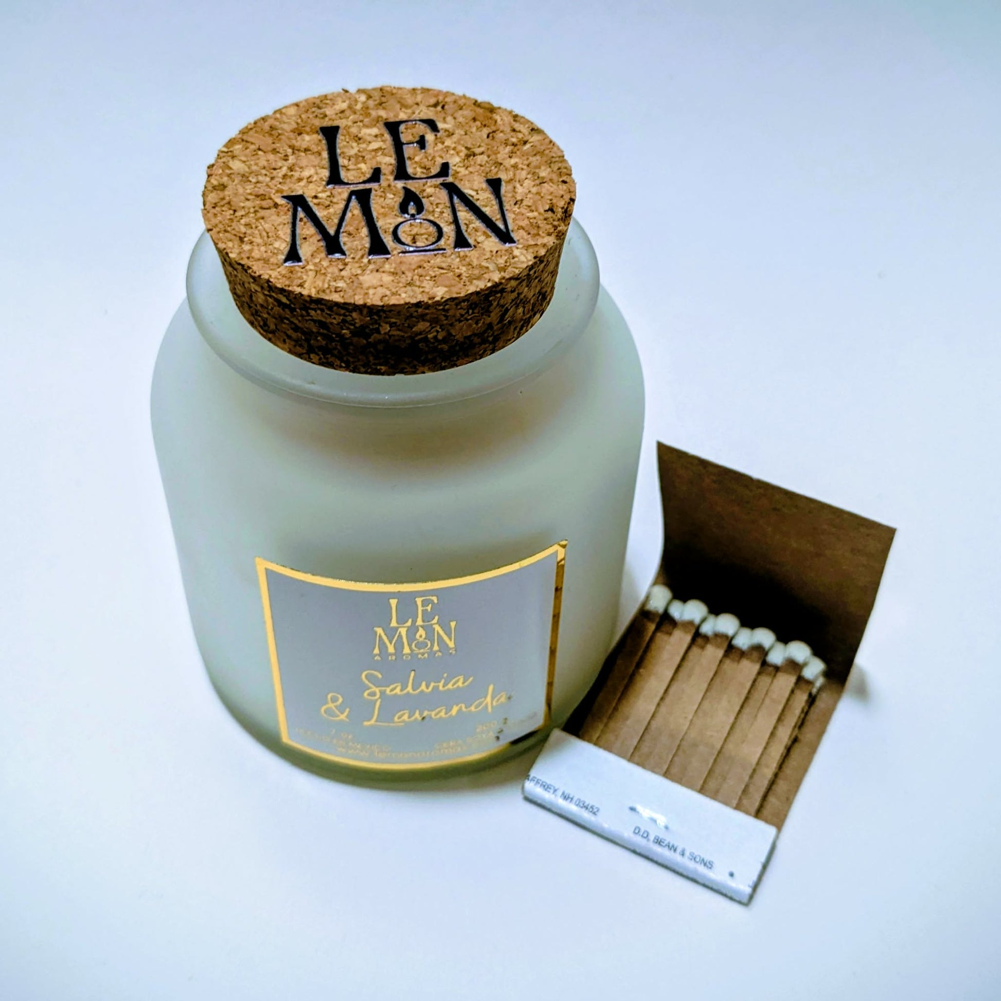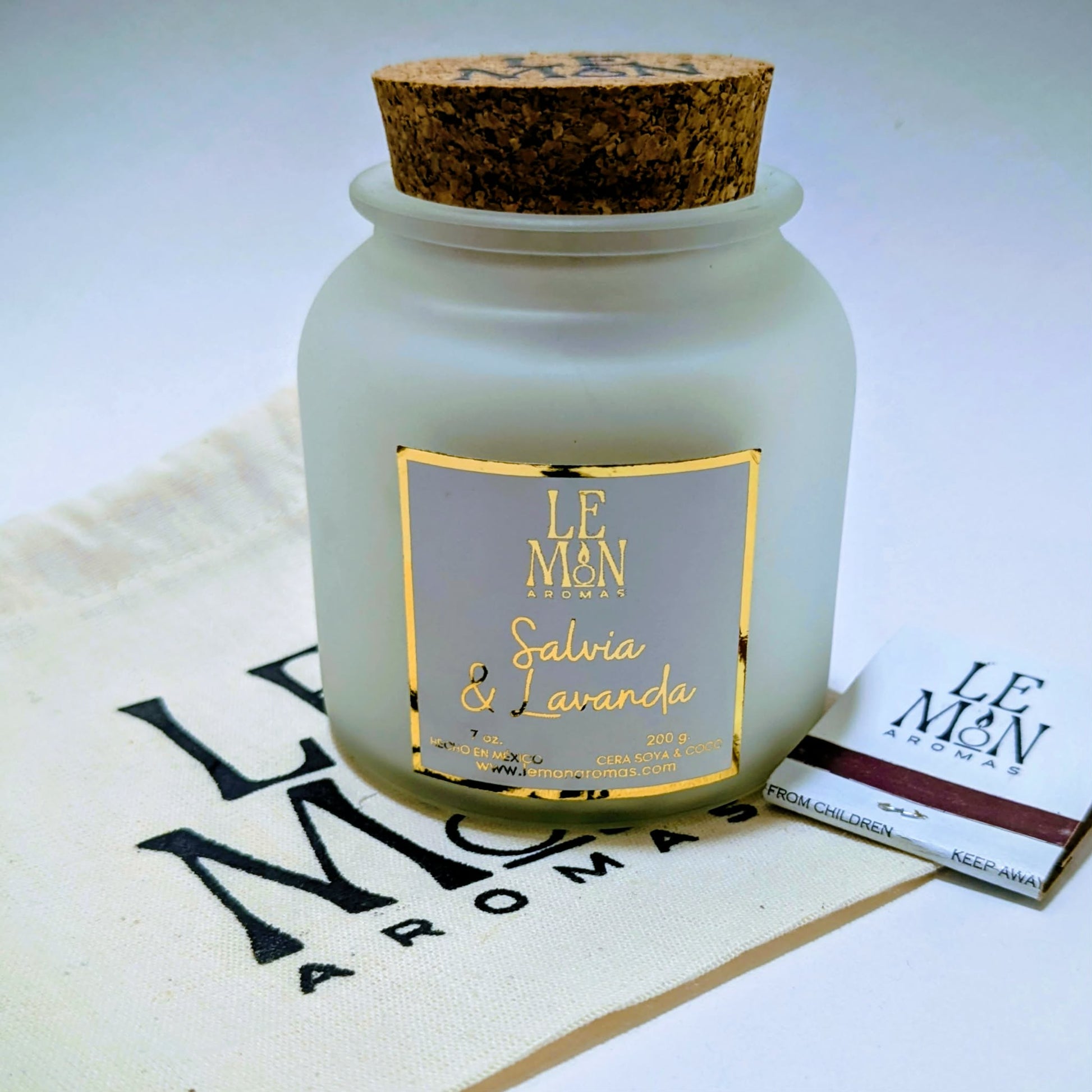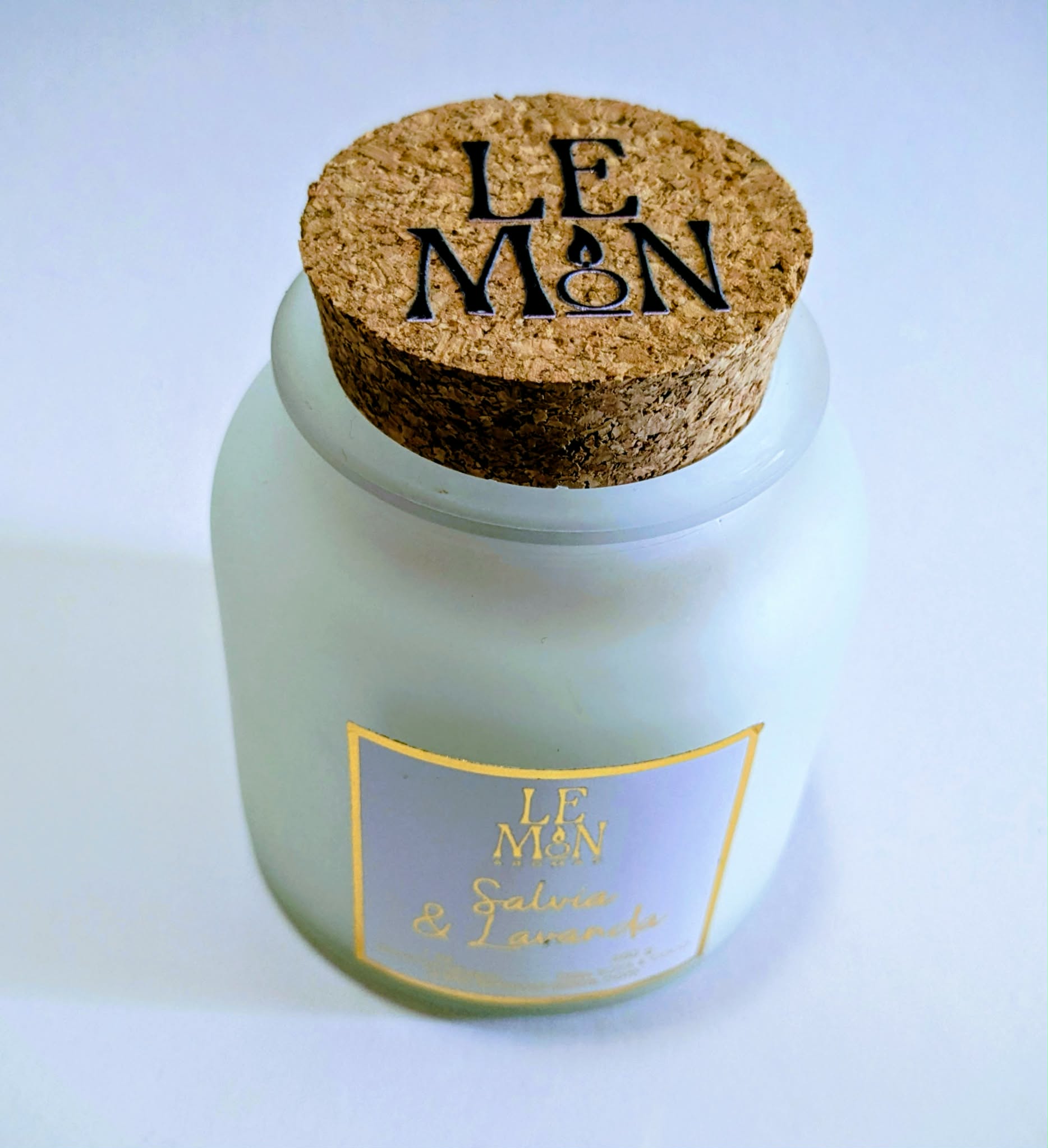 Vela aromática hecha a mano en un elegante vaso de vidrio blanco con tapa de corcho y nuestra combinación de ceras naturales de soya y coco.