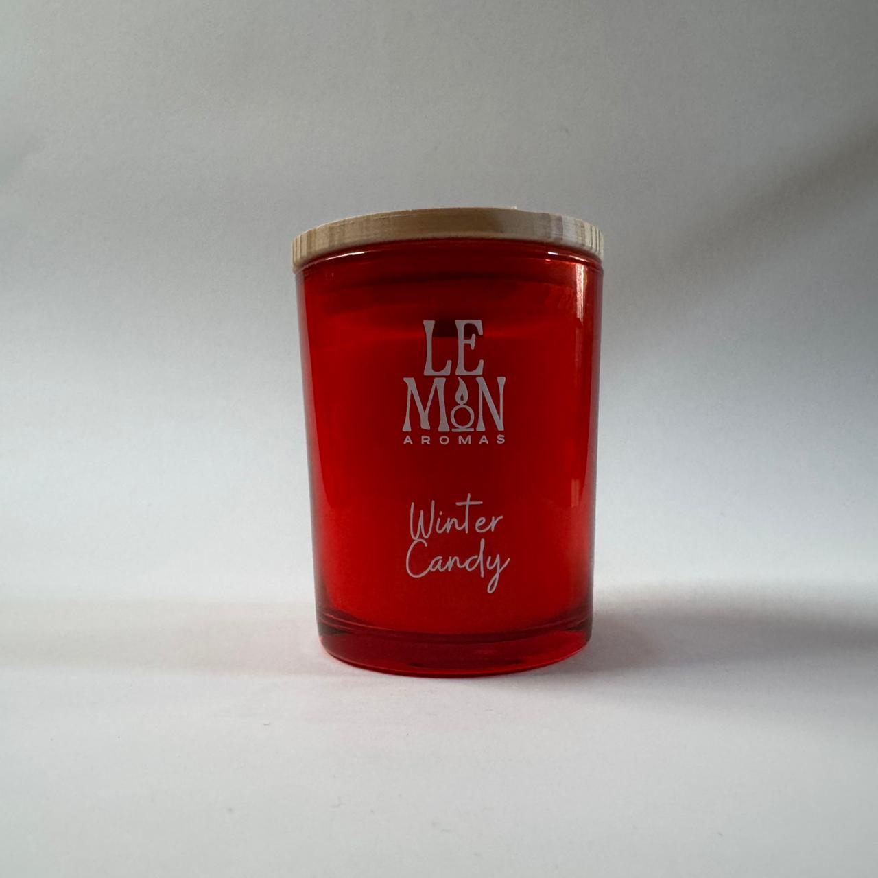 Vela aromática de lujo en envase rojo de vidrio y tapa de madera con nuestra combinación de ceras naturales de soya y coco, amigables con el medio ambiente y con tu salud.
